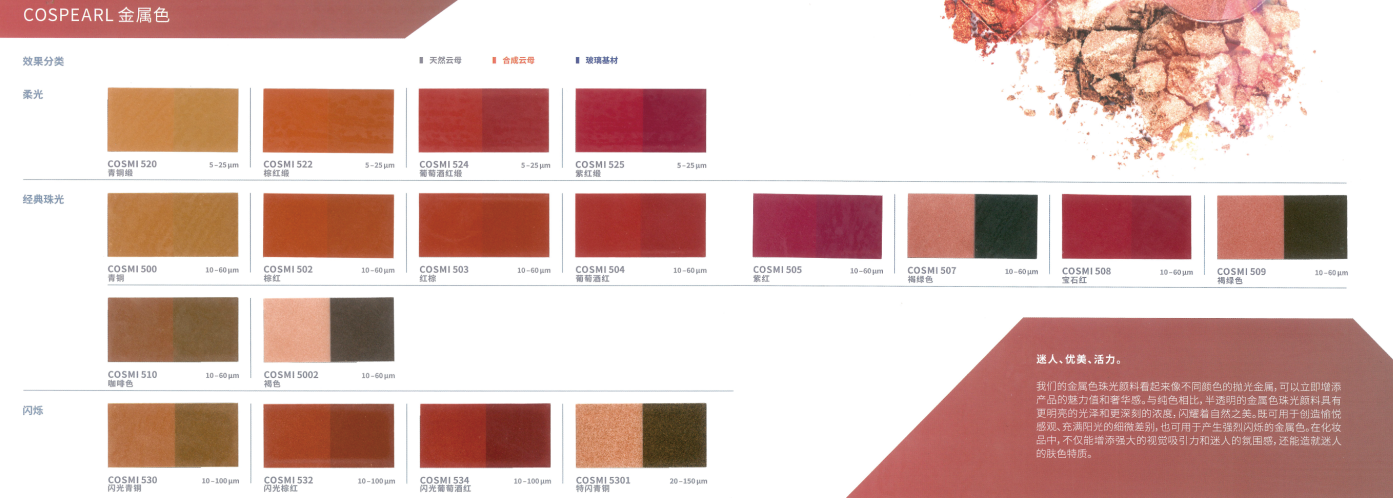 CosPearl 是我們以天然云母為基材的標(biāo)準(zhǔn)產(chǎn)品系列,色彩范圍廣,可應(yīng)用于彩妝和個(gè)護(hù)產(chǎn)品。云母薄片包覆金屬氧化物,如二氧化鈦或氧化鐵。通過光的折射、反射和干涉產(chǎn)生獨(dú)特的光澤和色彩效果,包括銀白色和彩色珠光,以及金色和閃爍的金屬色效果。同時(shí),虹彩系列也使依賴角度而變化的色彩設(shè)計(jì)成為可能。根據(jù)珠光顏料粒徑的不同大小,效果從絲絨啞光到璀璨閃光不等。這就意味著粒徑大小也會(huì)影響遮蓋率,產(chǎn)品的粒徑越細(xì)遮蓋越好,反之,粒徑越大遮蓋就越透。此系列適合用于天然化妝品,能讓成品具有典型的珠光效果。CosPear 易于混合,幾乎可以為每一種應(yīng)用增添閃亮和光澤。