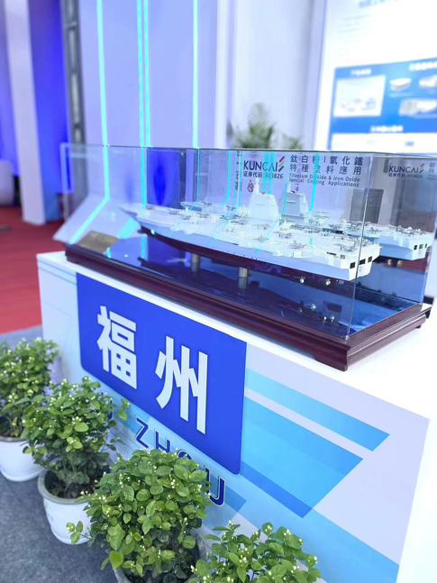 據(jù)海創(chuàng)會(huì)官網(wǎng)介紹,創(chuàng)新成果“全球首套萃取法氯化鈦白”的項(xiàng)目狀態(tài)為“可產(chǎn)業(yè)化”,合作方式包括“技術(shù)入股及其它”。在海創(chuàng)會(huì)的線下展廳,坤彩科技展示了白色外觀極為耀眼的“福建艦”模型,將鈦白粉涂料與受萬眾矚目的“福建艦”模型相結(jié)合,讓逛展者能直觀看到高端鈦白粉和氧化鐵的應(yīng)用場景和成品特性。